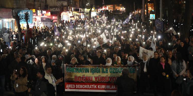 Demokratik Kurumlar Platformu önderliğinde, Abdullah Öcalan üzerinde 15 Şubat 1999’da gerçekleşen Uluslararası Komplo’nun 27. yıl dönümü için bir yürüyüş düzenlendi. “Hakikatin ışığıyla özgürlüğe doğru” sloganıyla gerçekleşen yürüyüşe DBP Eş Genel Başkanı Keskin Bayındır ve birçok siyasi parti temsilcisi katıldı. Koşuyolu Parkı Insan Hakları Anıtı önünde toplanan binlerce kişi, Abdullah Öcalan’ın fotoğrafıyla donatılmış bayraklar taşıdı. Yürüyüşte “Kes nikare tu cari roja me tarî bike” pankartı açılarak, komploya karşı ışıklar yakıldı ve sloganlar atıldı. Konuşmalar sırasında teslim olunmayacağı ve mücadelenin devam edeceği vurgulandı. Keskin Bayındır, İmralı Heyeti’nin İmralı’ya gideceğini ve Abdullah Öcalan’a selamlarını ilettiklerini belirtti. Kitle, Uluslararası komploya karşı direnişin sürdürüleceğini ve Öcalan’ın özgürlüğüne kadar mücadele edileceğini seslendirdi. Son olarak devlete seslenen Bayındır, barışın temelinin Öcalan’da olduğunu vurgulayarak, Kürt halkının Öcalan’ın özgürlüğü ve barış için mücadele etmeye devam edeceğini ifade etti.